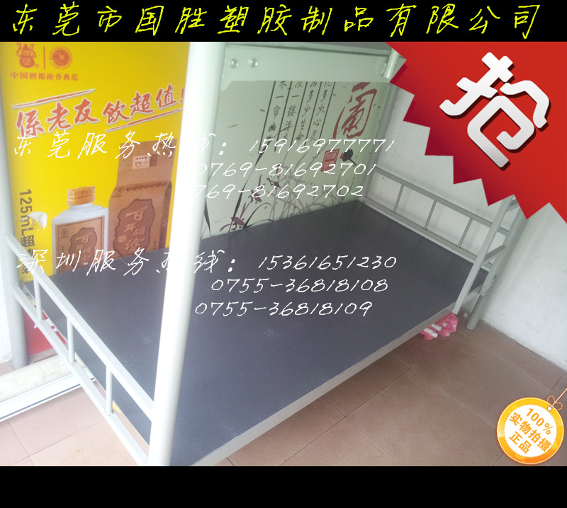 本公司专业供应员工宿舍睡觉用的胶床板、塑胶床板、塑料床板 ;本产品具有良好的稳定性,表面平整光洁卫生,无缝隙无气泡无小孔,臭虫根本没有藏身之处,实心不长虫,耐酸碱防老化,防潮防火防臭虫~蛀虫!耐用长达10年以上。对人体决无伤害、无味,代替易生虫不耐用的木床板。"国胜塑胶制品"珠三角连锁经营配送速度快,可按客户要求的规格量身定做,国胜塑料床板业务网络遍布深圳福田区、罗湖区、南山区、盐田区、宝安区、坪山新区、龙岗区,东莞莞城、南城、东城、万江、石碣、石龙、茶山、石排、企石、横沥、桥头、谢岗、东坑、常平、寮步、大朗、黄江、清溪、塘厦、凤岗、长安、 虎门、厚街、沙田、道滘、洪梅、麻涌、中堂、高埗、樟木头、大岭山、望牛墩等镇区,只要您一个电话,宿舍里的臭虫问题就能够得到充分解决!员工睡眠就能够得到很好提升,上班精神饱满,工作效率提高,珠三角最给力厂家-国胜塑胶公司提供表面光洁卫生规格可定制的床板、胶床板、塑胶床板、塑料床板、铁架床床板、不长虫的床板、不生虫的床板、不长臭虫的床板、不生蛀虫的床板.